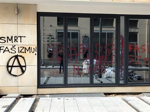 A homlokzatra anarchista jelképeket és feliratokat festettek. Többek közt ezt: Szabadságot Ahmed H-nak. A szír férfi az a terrorizmus vádolt bevándorló, aki 2015 szeptemberében egy hangosbeszélőn keresztül kerítésbontásra és a rendőrök megtámadására uszította a határon felgyűlt migráns tömeget.