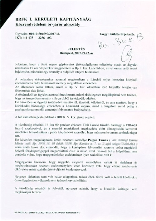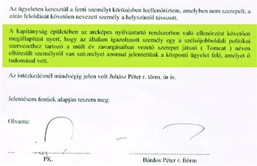 "A kapitányság épületében az arcképes nyilvántartó rendszerben való ellenőrzést követően megállapítást nyert, hogy az általam igazoltatott személy egy a szélsőjobboldali politikai szervezethez tartozó a múlt év zavargásaiban vezető szerepet játszó ( Tomcat ) néven elhíresült személyről van szó.melyet azonnal jelentettünk a központi ügyelet felé, amit ő tudomásul vett."