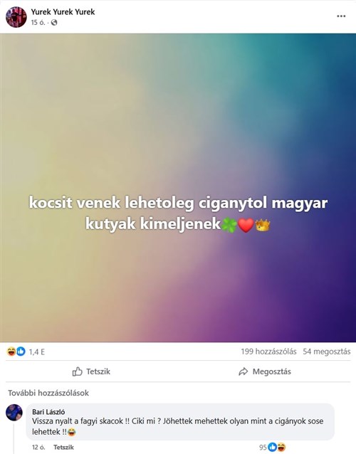 A tiszaújvárosi Horváth Iván Facebook-profilján jelentetett meg egy magyargyűlölő bejegyzést, mely szerint autót szeretne vásárolni, de lehetőleg cigányoktól, a "magyar kutyák kíméljék".