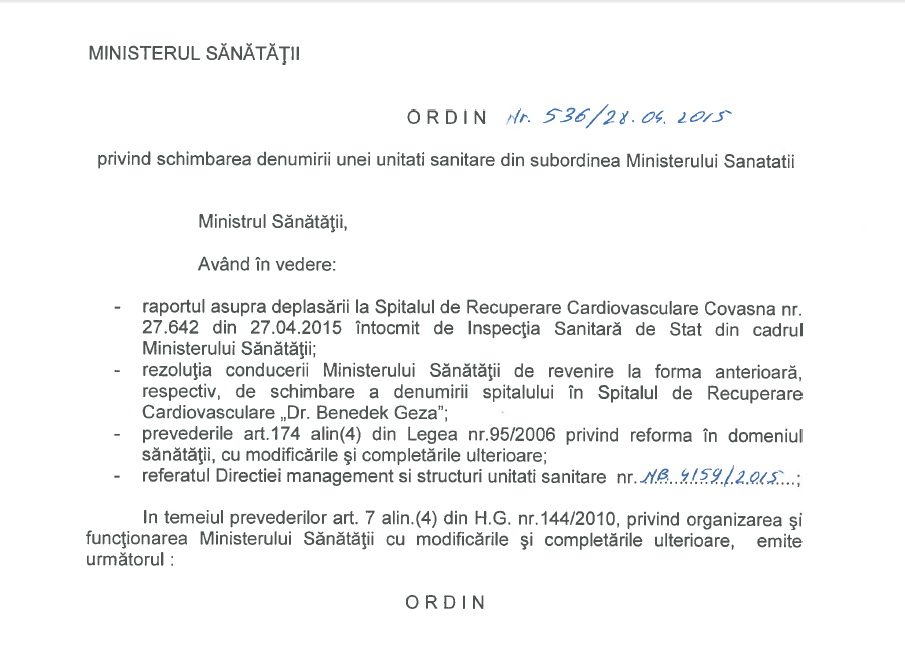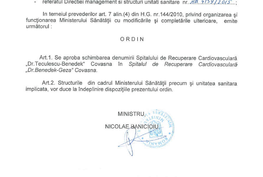 Nicolae Banicioiu egészségügyi miniszter rendelete nyomán ismét Dr. Benedek Géza Szív- és Érrendszeri Rehabilitációs Kórháznak hívják a székelyföldi Kovászna fürdőváros nemzetközi elismertségű intézményét.