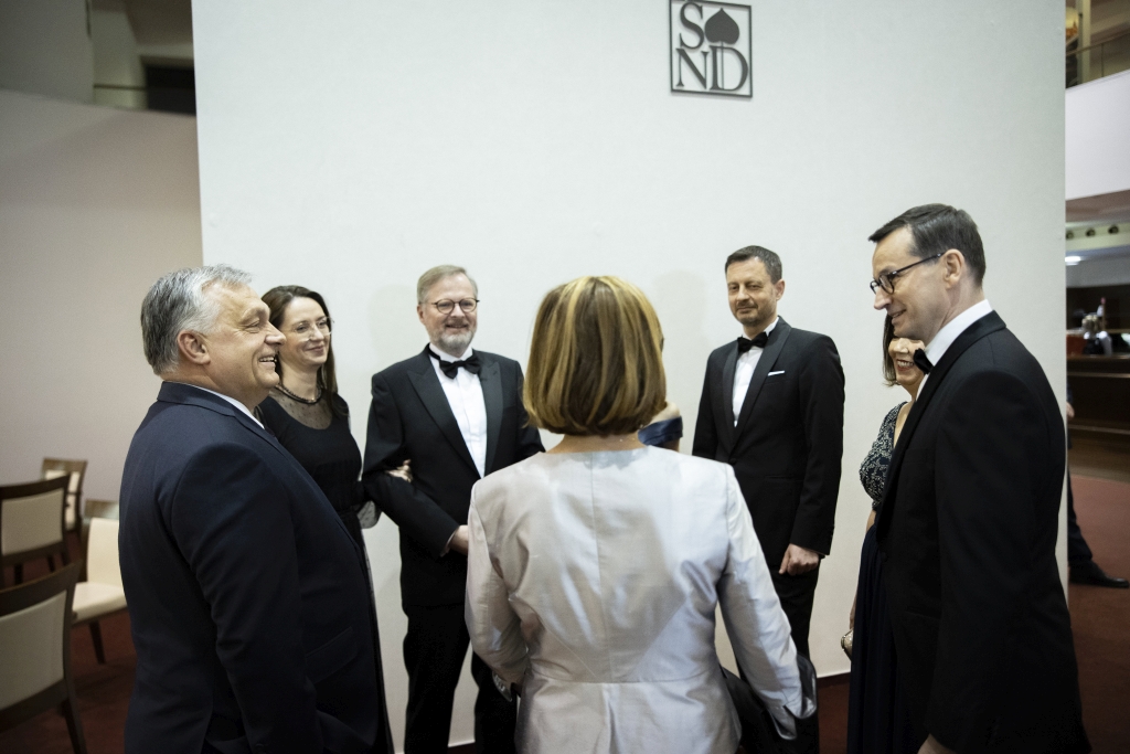 Orbán Viktor miniszterelnök (b), Petr Fiala cseh (b3), Eduard Heger tót (j3) és Mateusz Morawiecki lengyel kormányfő (j), valamint házastársaik az "önálló Szlovákia" megalakulásának 30. évfordulója alkalmából rendezett gálaesten