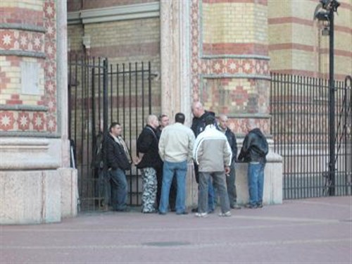 A fotózás után a nagydarab, kopasz "szkinhedek" hirtelen gyáva kis nyuszikká váltak, és elbújtak a zsinagóga oszlopai mögé, aztán elővették a fényképezőgépüket, hogy minket is megörökítsenek az utókornak.