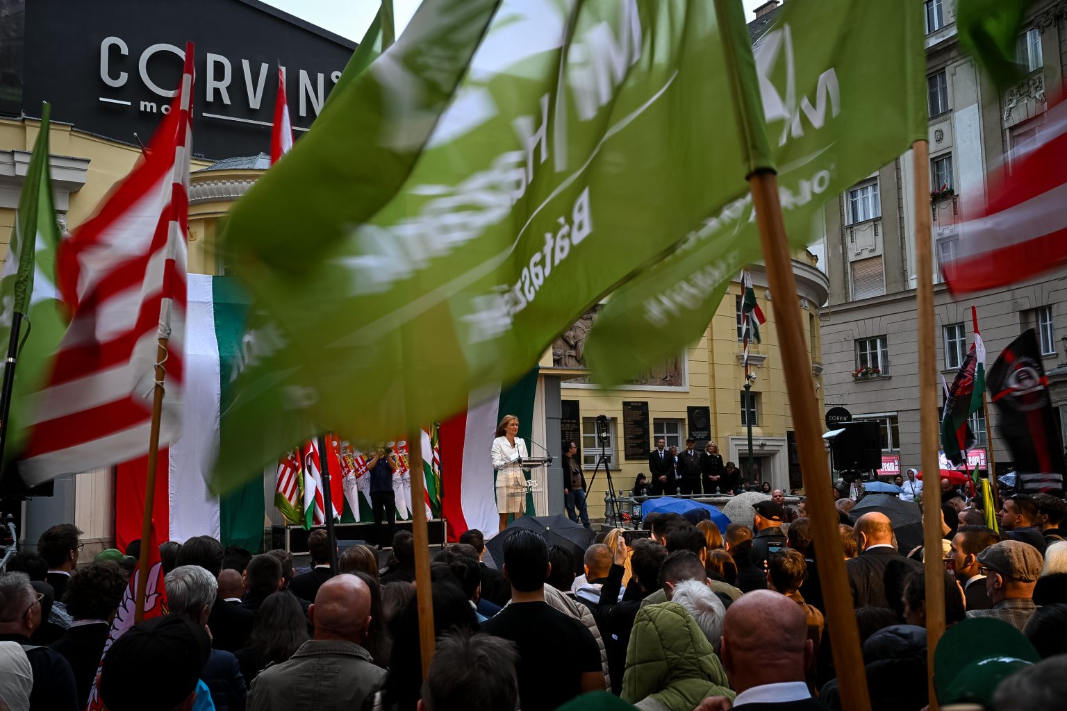 A hivatalos program szerint 15 órakor kezdődött a Mi Hazánk október 23-i rendezvénye, ám helyszíni tudósítóink arról tájékoztattak, hogy már jóval három előtt színültig megtelt a budapesti Corvin köz, az 1956-os antikommunista felkelés ikonikus helyszíne. A résztvevők összetétele meglehetősen vegyes volt: a legfiatalabbtól a legidősebb generációig mindenki képviseltette magát. Sokan vittek magukkal nemzeti színű zászlót, de természetesen mi hazánkos jelképekből sem volt hiány.