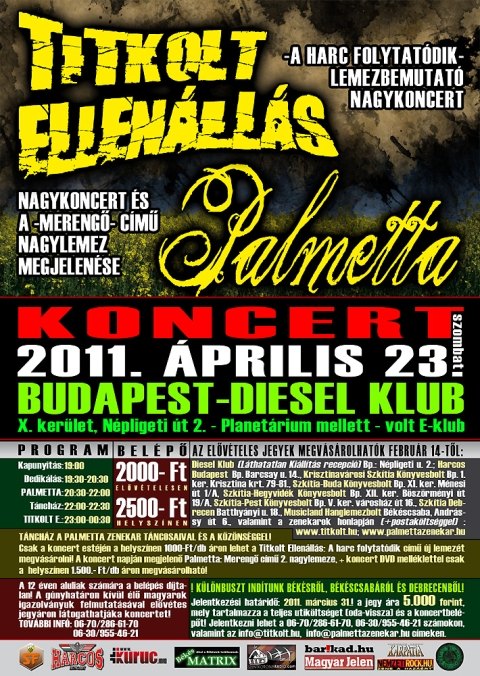 Csak a koncert estéjén a helyszínen 1000-Ft/db áron lehet a Titkolt Ellenállás: A harc folytatódik című új lemezét megvásárolni! A koncert napján megjelenő Palmetta: Merengő című 2. nagylemez + koncert DVD-melléklettel (a X. Magyar Szigeten rögzített) csak a helyszínen 1.500.- Ft/db áron megvásárolható!