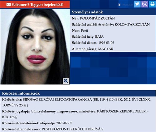 A Pesti Központi Kerületi Bíróság európai elfogatóparancsot bocsátott ki a bajai születésű Kolompár Zoltán ellen. A férfi ellen kábítószer-kereskedelem bűntette miatt folyik eljárás, azonban a hatóságok elől ismeretlen helyre távozott, így a felkutatására tett eddigi intézkedések nem vezettek eredményre, írja a Zsaruhírek.