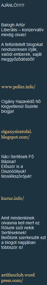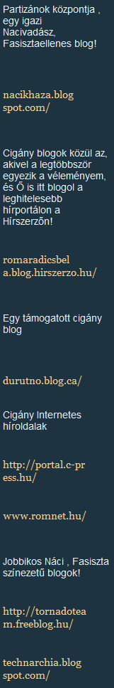 Az ajánlott oldalak között még ott szerepel a hírhedt Nácik, haza! (mint “Partizánok központja , egy igazi Nacivadász, Fasisztaellenes blog!”), Cigány Roxána szintén hírhedt blogja (mint “Cigány Hazavédő Nő Kegyetlenül őszinte blogja!”) és pár egyéb, pl. “Jobbikos Náci , Fasiszta színezetű” oldal.