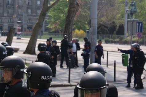 A Földművelésügyi Minisztérium árkádjainál, az Alkotmány utca sarkánál kis dulakodás alakult ki. A droidok provokáltak. Ekkor láttam az első libát is a lábuk közt vergődni. Ennek a tumultusnak a láttán valakiben felmehetett a pumpa és messziről, nem a tömegből, a színpad felől, mindannyiunk háta mögülről egy félliteres zöld palack repült a sünökhöz. Erre a droid, akit eltalált a palack, a hozzá legközelebb álló embert megragadta, és a mellette álló társaival együtt "bekebelezték". Ez volt a képen látható bácsi.