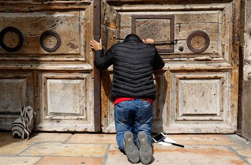 Zarándok a Szentsír-bazilika kapuján kívül kénytelen imádkozni (fotó: AFP)