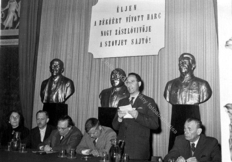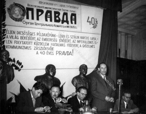 Betlen Oszkár beszédet mond a MÚOSZ-ban a Pravda tiszteletére rendezett ünnepségen 1952. május 5-én