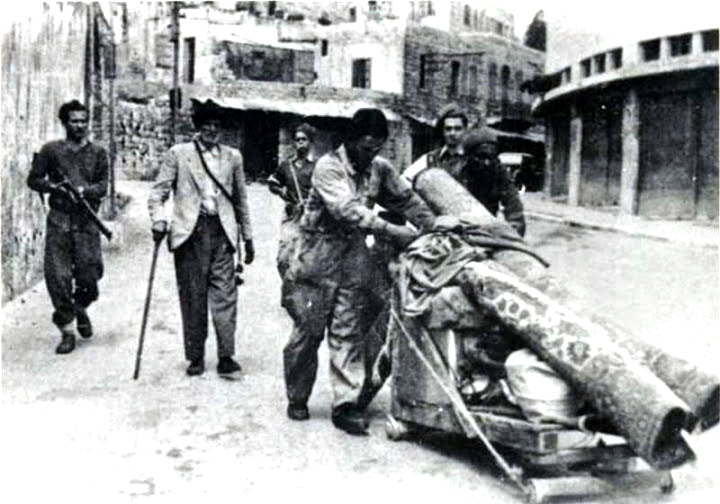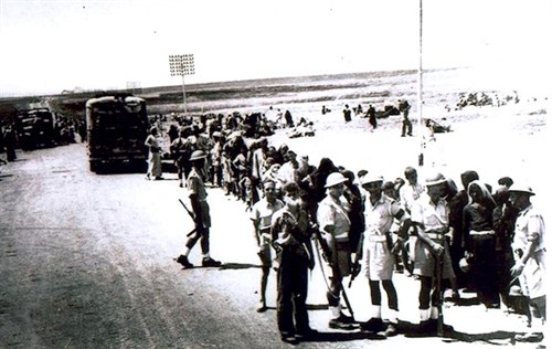 A Pálmách zsidó terrorszervezet fegyveresei (rövidnadrágban) palesztin polgári személyeket deportálnak Rámle városából 1948-ban