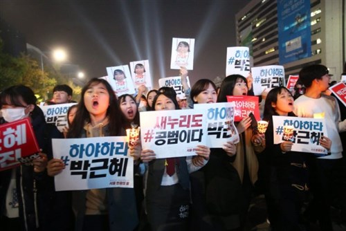 Az aktivisták transzparensekkel, gyertyákkal és színes táblákkal vonultak, amelyeken olyan feliratok voltak olvashatóak, mint “Pak Gun Hje távozz” és “Árnyékkormány árulása”. A tüntetők emellett hangosan követelték a dél-koreai államfő asszony lemondását.