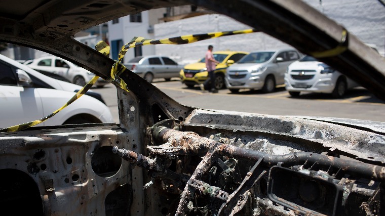 Kiégett autó Rio de Janeiro állam északi részén található Belford Roxo rendőrsége előtt 2016. december 30-án