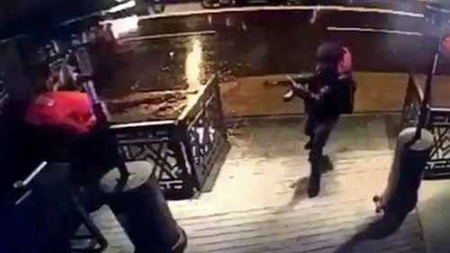 Fegyveres támadó érkezik az isztambuli Reina klubba a 2017. január 1-jére virradó éjjel. A támadó tüzet nyitott a szórakozóhelyen szilveszterezőkre, és legalább harminckilenc embert, köztük több külföldit, megölt, hatvankilencet megsebesített (MTI/EPA/DHA – Depo Photos)