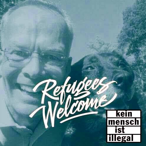 A würzburgi plébános nemrégiben könyvet is írt a sáskasimogatás népszerűsítésére, s az Fb-oldalán az ő és kutyája képe mellett ez olvasható, természetesen angolul: „Isten hozta a menekülteket!”, majd kissé lejjebb már németül: „Senki sem illegális”.