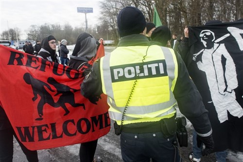 Migránssimogató és hazájukat védő tüntetők a dán-német határon, Krusaaban 2016 januárjában (Kép: AFP/Claus Fisker)