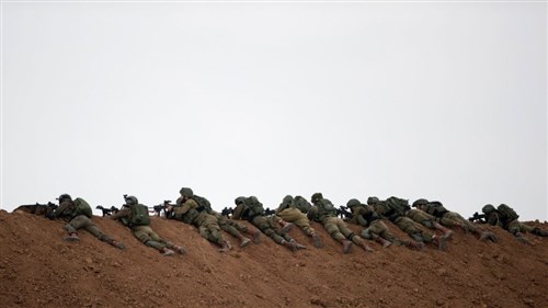 Izraeli katonák palesztin tüntetőkre lőnek a Gázai övezetet Izraeltől elválasztó határkerítésnél, Bét Hanún izraeli város közelében 2018. március 30-án (MTI/EPA/Atef Szafadi)