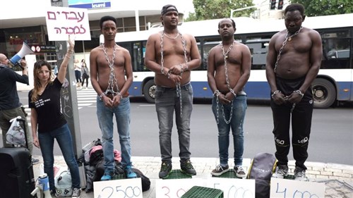 "Rabszolga eladó" – hirdeti az emberi jogvédő izraeli aktivista Tel-Avivban, tiltakozva az ellen, hogy Izrael pénzt fizet kitoloncoltakat befogadó országoknak (fotó: Tomer Appelbaum)
