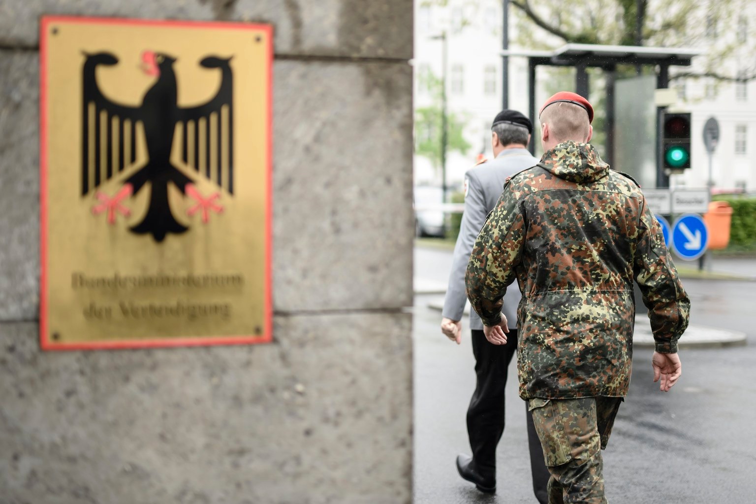 A Bundeswehr tagjai lépnek be a német védelmi minisztérium épületébe (fotó: EPA/Clemens Bilan)