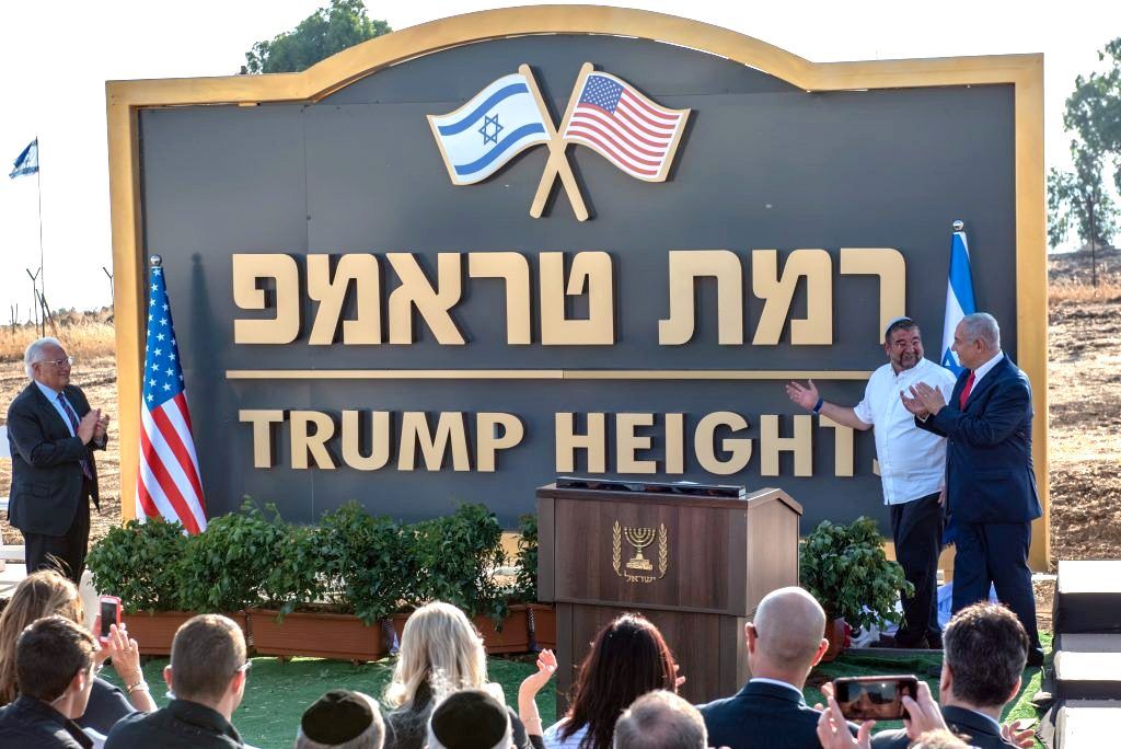 Bibi viszont már a településavatás közben csiripelt héber nyelven a következőképpen: „Donald Trumpról, Izrael barátjáról, az Amerikai Egyesült Államok elnökéről elnevezett új települést avatunk a Golán-fennsíkon. Történelmi nap.” A csiripeléshez Netanjáhu az amerikai és az izraeli zászlót mellékelte, míg a szöveghez csatolt fényképen a fölavatott „Trump-fennsík” zsidótelepülés helységnévtáblája előtt balról jobbra haladva David Messias Friedman nagykövet, a felesége, Bibiné és Bibi feszít.