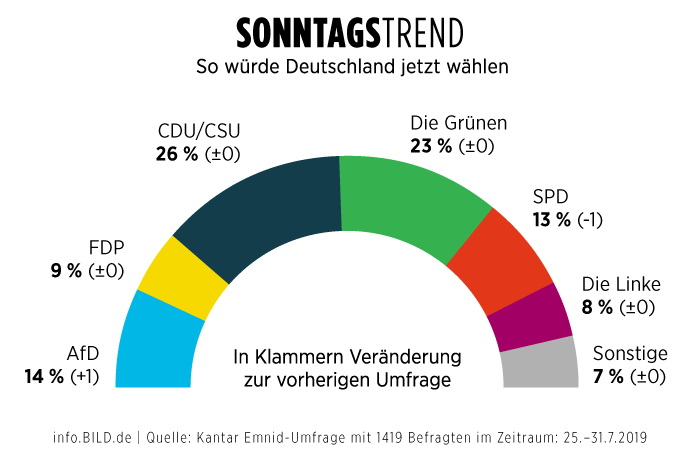 1. CDU/CSU (26%), 2. Zöldek (23%), 3. AfD (14%), 4. SPD (13%).