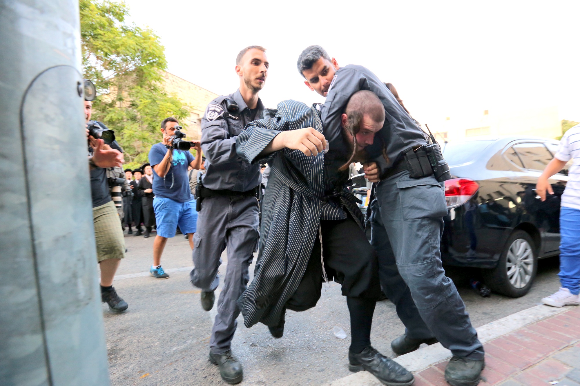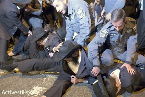 „Náci” rendőrök földre szorítanak „békés” ortodox zsidókat Jeruzsálemben (fotó: Oren Ziv)