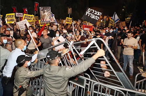 A rendőrkordont ostromló tüntetők Netanjáhu otthona körül