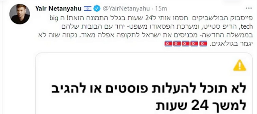 Jáir Netanjáhu írt egy másik, ám kicsit később saját maga által törölt bejegyzést is az Fb-oldalára: „Az Instragram törölte a Nir Orbach háza előtti tüntetésre hívó plakátomat! Itt van már 1984!” (célzás George Orwell Ezerkilencszáznyolcvannégy című szatirikus politikai regényére – H. J.). Bibifi ezt a bejegyzést is észak-koreai zászlókkal díszítette.