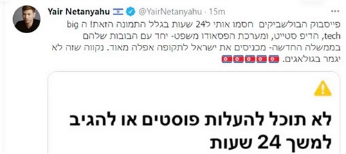 A Twitter 12 órára, míg a Facebook és az Instragram 24 órára törölte Jáir Netanjáhu, az izraeli miniszterelnök, Binjámin Netanjáhu fiának az oldalát, illetve fiókját. A nevezett három közösségi hálózat azért kényszerült erre a lépésre, mert Bibifi tegnap közzétette Nir Orbach, a Jáminá (Jobbra! – ימינה) nevű párt parlamenti képviselője magánlakásának nem publikus címét. Jáir Netanjáhu az oldalára kitett plakáttal egyben arra buzdította a Likud párt híveit, hogy tüntetés keretében „látogassák meg” az édesapja következő miniszterelnöki ciklusát megakadályozni szándékozó politikus otthonát. Erre a „látogatásra” egyébként sor is került.