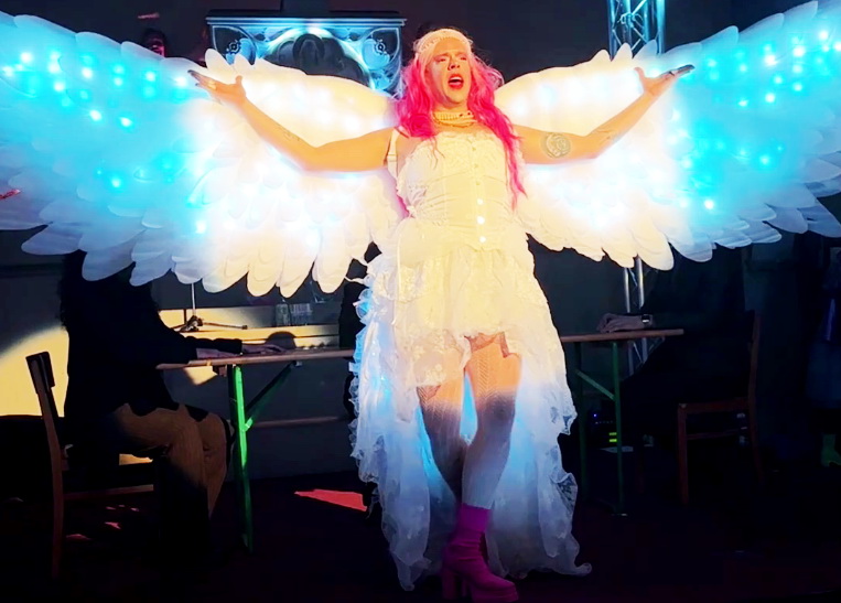 Mennyből az angyal (bácsi) a betlehemes játékot követő „drag show”-ban (fotó: rbb24.de)