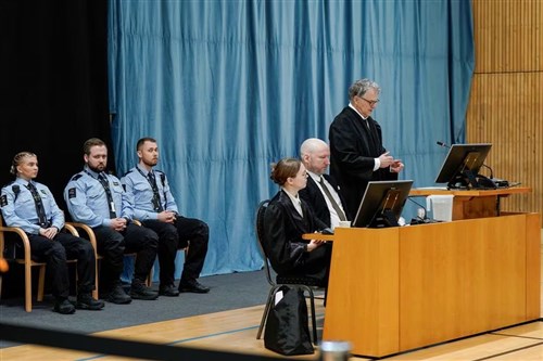 A fekete öltönyt, fehér inget és barna nyakkendőt viselő elítélt hétfőn jelent meg az Oslótól 70 kilométerre északnyugatra fekvő szigorúan őrzött börtönének tornatermében megszervezett tárgyaláson.