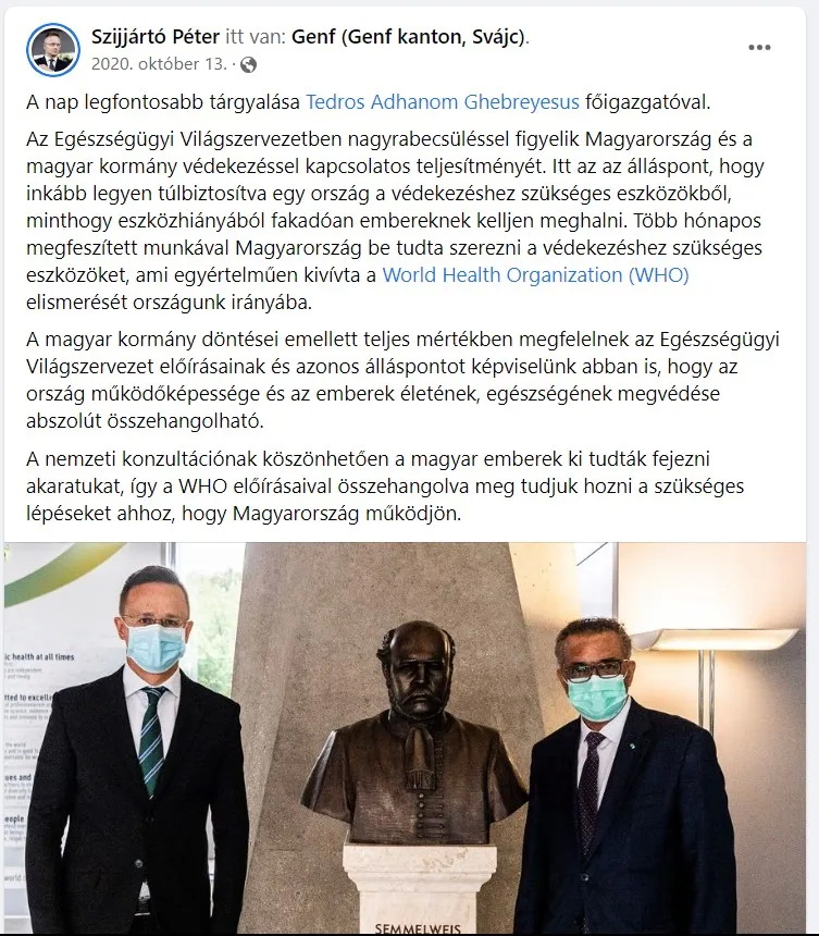 A magyar kormány a Covid-diktatúra alatt is mindenben a WHO elvárásai szerint járt el, ezzel Szijjártó Péter büszkélkedett is a közösségi oldalán.