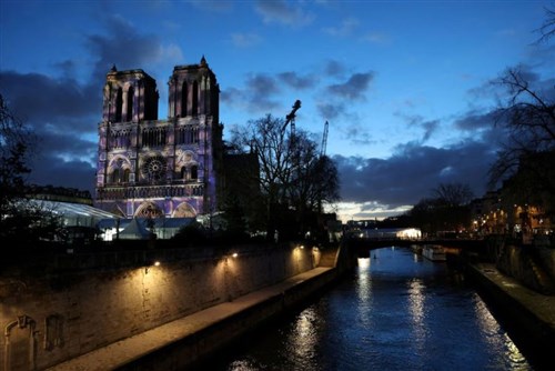Fényshow-próba a Notre Dame homlokzatán az újranyitási ünnepség előtt 2024. december 6-án (fotó: Reutrers/Kevin Coombs)
