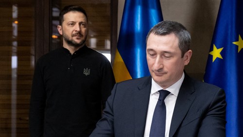 Zelenszkij és Olekszij Csernisov 2025. február 15-én (fotó: Sven Hoppe / Pool / AFP)