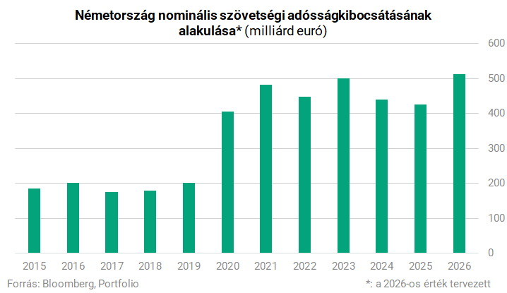 A kormány adósságát kezelő frankfurti ügynökség (DFA) csütörtöki közleménye szerint 2026-ban mintegy 318 milliárd euró értékben bocsátanak ki értékpapírokat a tőkepiacokon aukciókon keresztül, további 176 milliárd eurót pedig a pénzpiacon vonnak be. Emellett 16–19 milliárd euró értékben zöldkötvény-kibocsátás is várható.