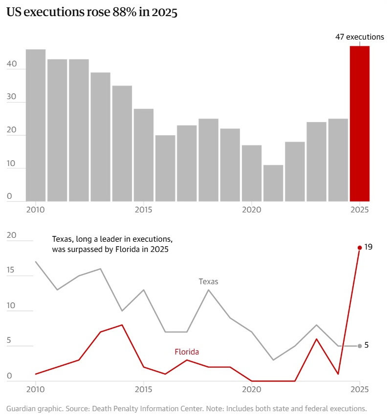 2025-ben az Egyesült Államokban ugrásszerűen megnőtt a kivégzések száma – elérve az elmúlt 16 év legmagasabb szintjét –, amivel gyakorlatilag megduplázódott a kivégzések száma 2024-hez képest – írja a Guardian nyomán a 24.