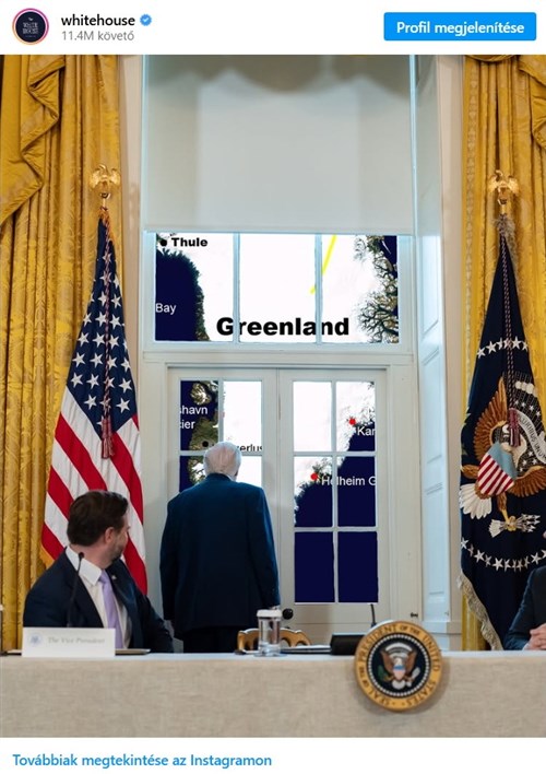 Provokatív fotómontázst tett közzé a Fehér Ház, amelyen Donald Trump az Ovális Iroda egyik ablaka előtt Grönland odaszerkesztett térképét kémleli. Mindezt a szerdai, Grönland-ügyben tartott washingtoni csúcstalálkozó előtt.