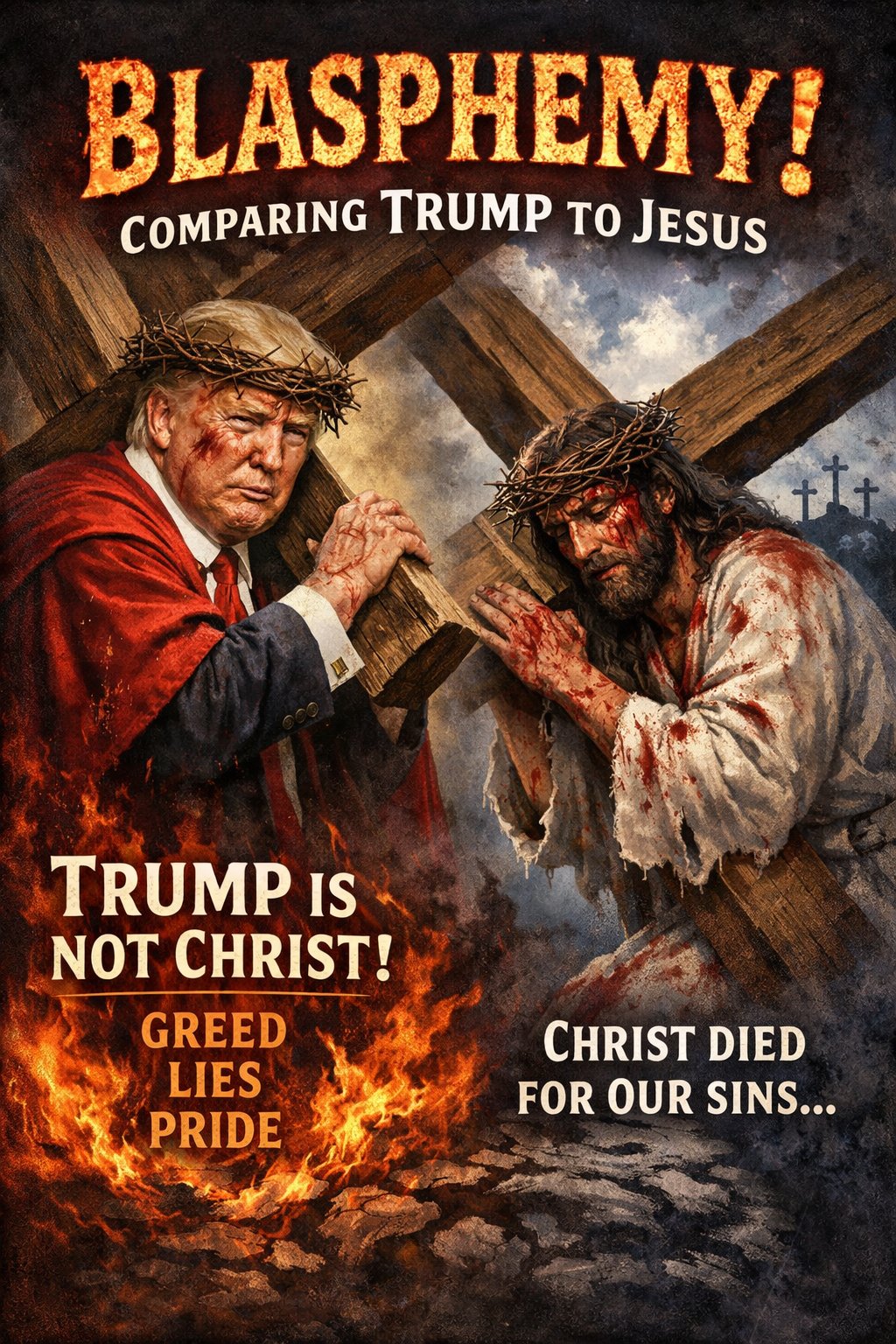 Istentelen trollok most azon viccelődnek a közösségi médiában, hogy keresztre kellene feszíteni Trumpot, és ha három nap múlva visszatér, akkor tényleg ő Jézus reinkarnációja. Egy próbát mindenképpen megérne.