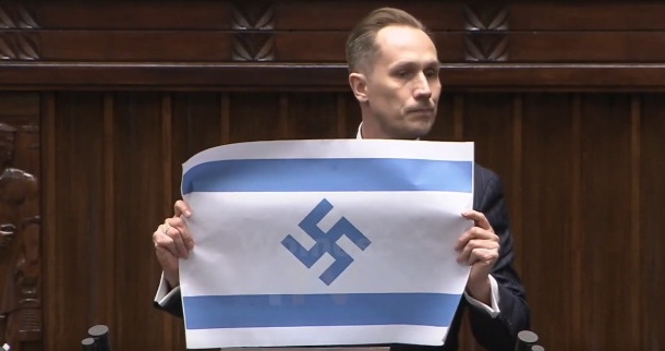 Polish MP Konrad Berkowicz compares Israel’s crimes against humanity to those of the Third Reich and displays an Israeli flag with a swastika.
