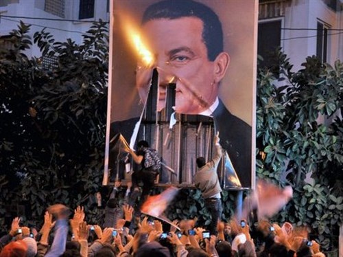 Tüntetők leszaggatják Huszni Mubárak óriásfotóját Alexandriában