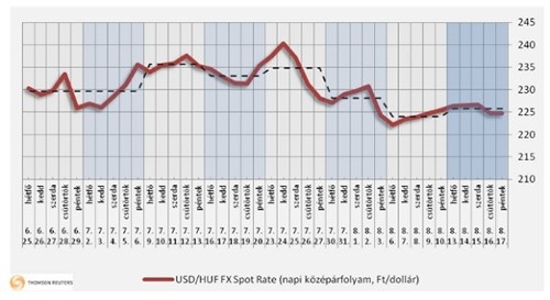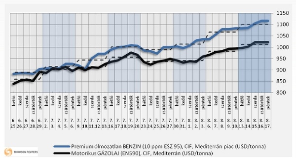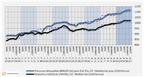 A hazai üzemanyagárak változását alapvetően két tényező alakítja: az üzemanyagok nemzetközi piaci árváltozása és a forint-dollár árfolyamának alakulása. A prémium ólmozatlan benzin (10 ppm ESZ 95) tonnánkénti ára (dollárban) a mediterrán piacon az elmúlt héthez képest számottevően emelkedett, átlagosan 3,2%-kal. A motorikus gázolaj (EN590) jegyzésára hasonló mértékben emelkedett, heti átlagban 3,0%-kal. A forint a dollárral szemben az elmúlt hét nap során némileg gyengült, átlagosan 0,8%-kal.