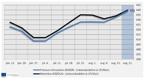 Az elmúlt egy hét során a nemzetközi piaci folyamatokban megfigyelhető változások a benzin és a gázolaj esetében is 5-7 forint áremelést indokolnak 20-án, hétfőn. A benzin kiskereskedelmi átlagára így 439 forint, a gázolajé pedig 440 forint lehet augusztus 22-én, szerdán.