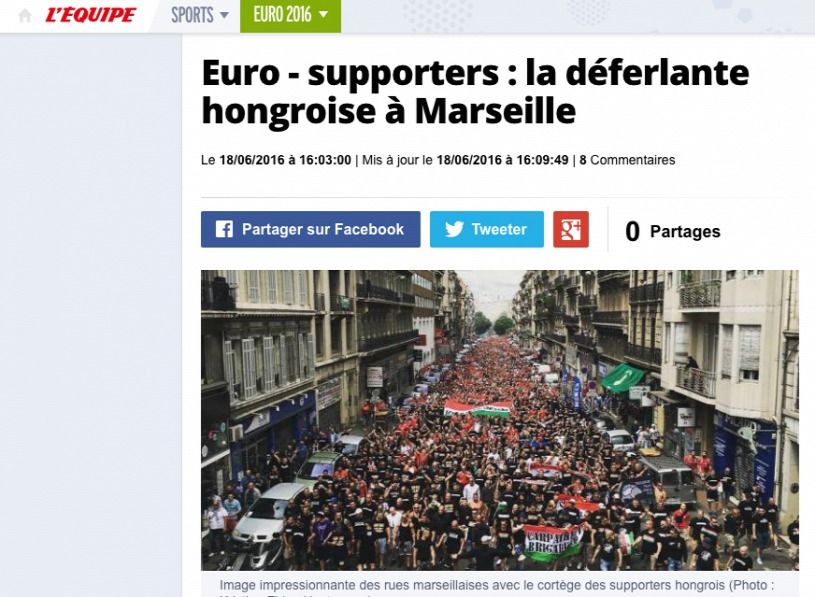 Az egyik legnagyobb francia lap, a L’Équipe képet és videót is posztolt cikkében a szurkolókról. „Az Ausztria elleni 2-0-s győzelem után a magyar válogatott Izland ellen is számíthat szurkolóira. Úgy tűnik, a drukkerek már készen állnak a meccsre, miután elképesztő hangulatot varázsoltak Marseille utcáira. Két órán belül a Stade Vélodrome-stadion izzani fog tőlük, ez nem kétséges” – írta a L’Équipe.