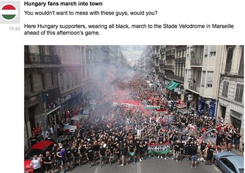 Megjegyzi, hogy legalább 20 ezer magyar szurkoló jelent meg Marseille-ben, ahova nagy részük 14 órás autóút végén érkezett meg. De közöl két képet a magyar ultrákról is, ahova csak annyit ír: „Ugye nem akarsz kikezdeni ezekkel a fiúkkal?”
