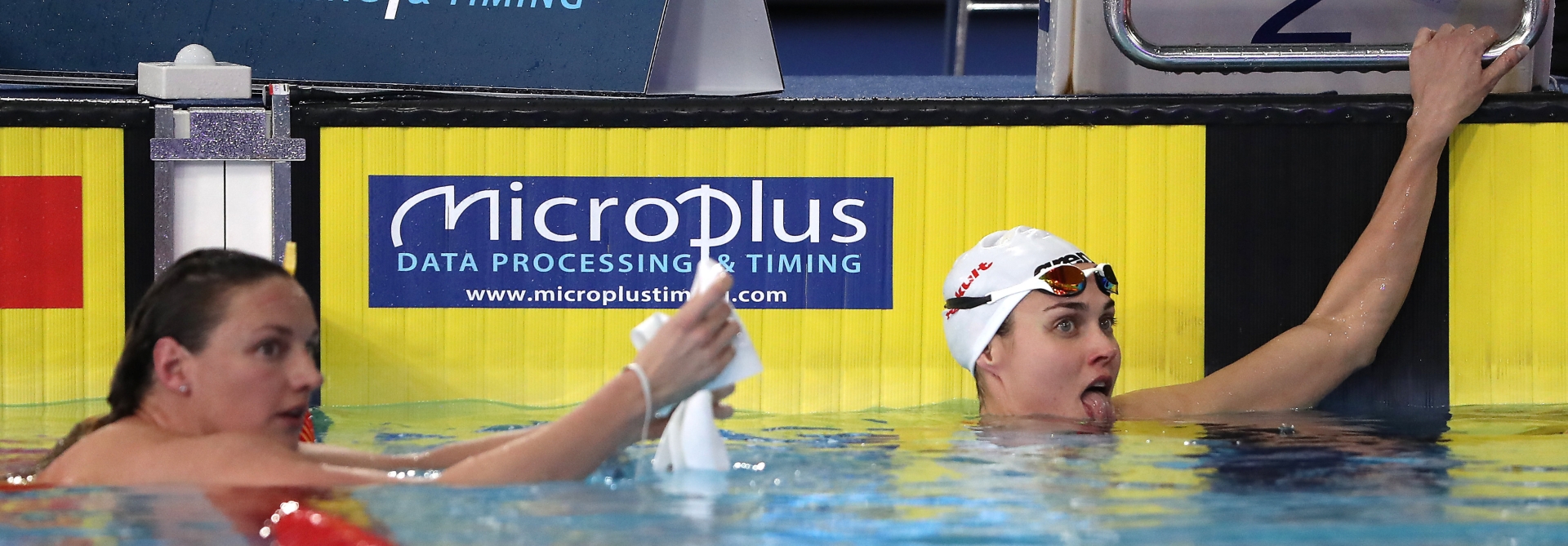 A győztes Hosszú Katinka (b) és a negyedik helyezett Jakabos Zsuzsanna a célban a 200 méteres vegyesúszás döntőjében glasgow-i rövidpályás úszó Európa-bajnokságon 2019. december 7-én. MTI/MTI Fotószerkesztőség/Illyés Tibor