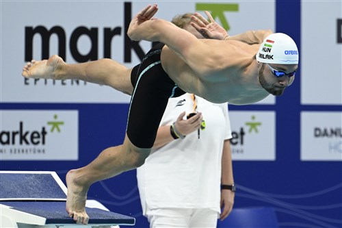 Milák Kristóf rajtol a férfi 100 méteres gyorsúszás előfutamában