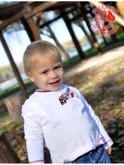 Kalocsai hímzés-feldolgozással díszített lányka póló, sólymos mintával kombinálva, színes selyemcérnával hímezve.