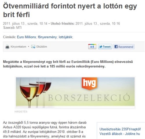 A cikk így folytatódik: "Az Euro Millions 2004-ben született, kilenc ország - Franciaország, Spanyolország, Nagy-Britannia, Luxemburg, Belgium, Svájc, Portugália, Írország és Ausztria - lottótársasága alkotja. Ez a legnagyobb lottójáték a világon, hetente kétszer húznak számokat; a kilenc ország összesen kétszáz millió lakost számlál, így a játékosok száma is óriási. A héten 92 millióan próbáltak szerencsét. Az alapnyeremény 20 millió euró, ez az összeg hízik tovább, ha senki sem találja el a számokat. A 185 milliós nyeremény azonban már nem dagadhatott volna tovább, mert ez a felső összeghatár a játékban."