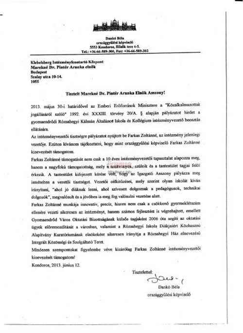 Nos, Farkasné pártszimpátiáját nem kellett sem akkor, sem most firtatni, azt Gyomaendrődön is minden közélet iránt érdeklődő ember tudja… Hogy a baloldal számára oly kedves Farkasné további öt évre még igazgató lehessen, beindult a háttérmutyi. A már említett Körösök Vidékéért Egyesület két prominens önkormányzati képviselője felkereste Várfi András fideszes polgármestert azzal a követeléssel, hogy Farkasné újabb kinevezése számukra rendkívüli jelentőséggel bír, ezért a polgármester vonassa vissza a másik jelentkező – egyébként minden téren jobb – pályázatát, ellenkező esetben a Körösök (vörösök) Vidékéért Egyesület önkormányzati képviselői többé soha semmit nem szavaznak meg a testületi üléseken…