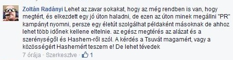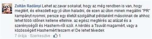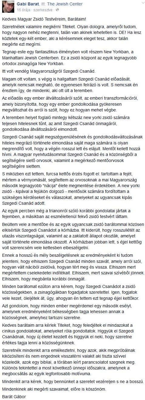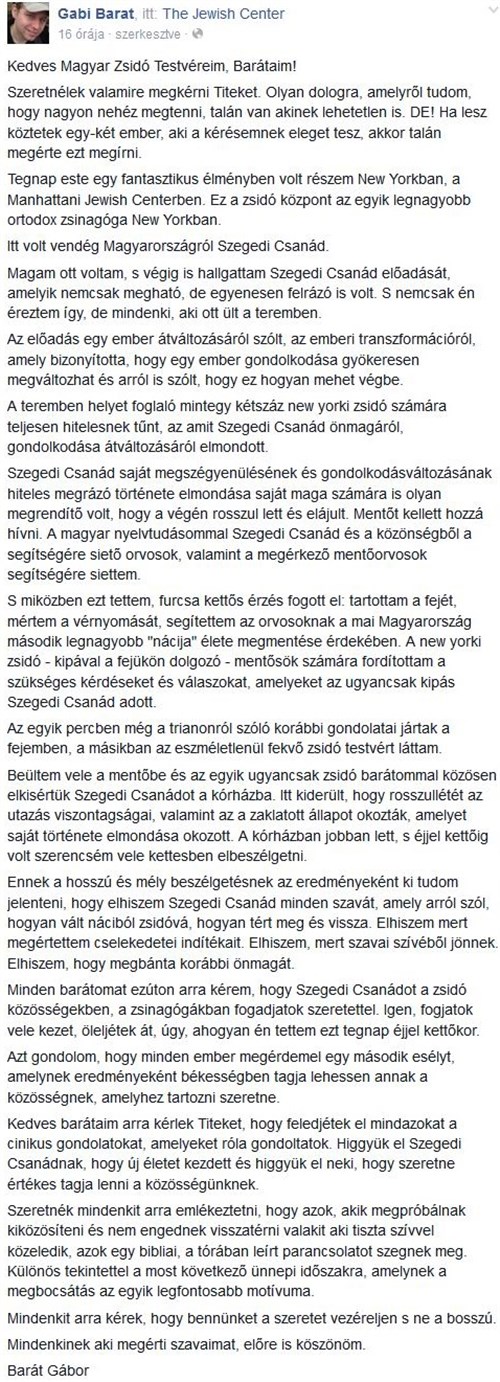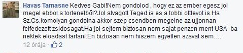 Töröljék le könnyeiket, kedves olvasók, lesz még rosszabb is. Gabi Barat bejegyzése alatt ugyanis több hozzászóló kételkedik Csanád csodálatos megigazulásában, belegázolva ezzel érzékeny lelkébe - emiatt bármikor, bárhol újra rátörhet a rosszullét, és akár el is ájulhat. Remélhetőleg akkor is lesz majd egy hímnemű kipás fajtárs, aki éjszaka ölelgetheti...