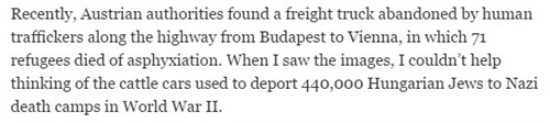 Kounalakisnak a bécsi autópályán talált teherautóban meghalt hetvenegy "menekültet" ábrázoló fényképekről "négyszáznegyvenezer magyar zsidó második világháborús náci haláltáborokba szállítása" jutott eszébe.